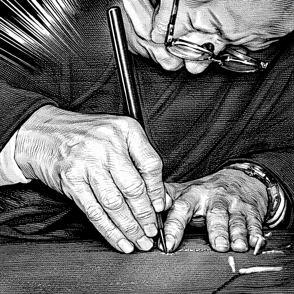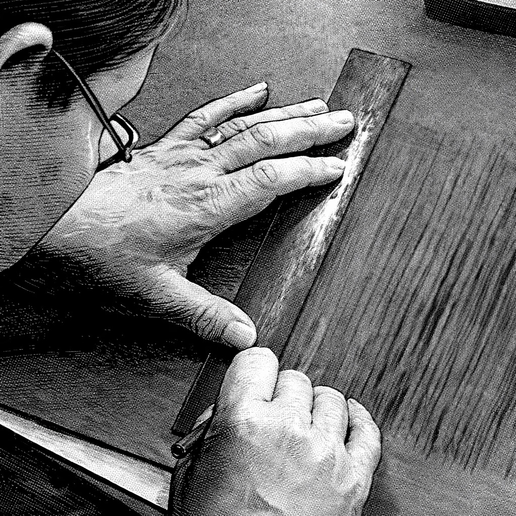 定規を使って等間隔に縞柄を彫り進める。単純作業に見えても、一本の縞を彫るのに3度続けて小刀でなぞるには熟練の技が必要。一寸幅に12本彫るのが「万筋」、毛のように細く20本彫るのを「毛万筋」と呼ぶ。